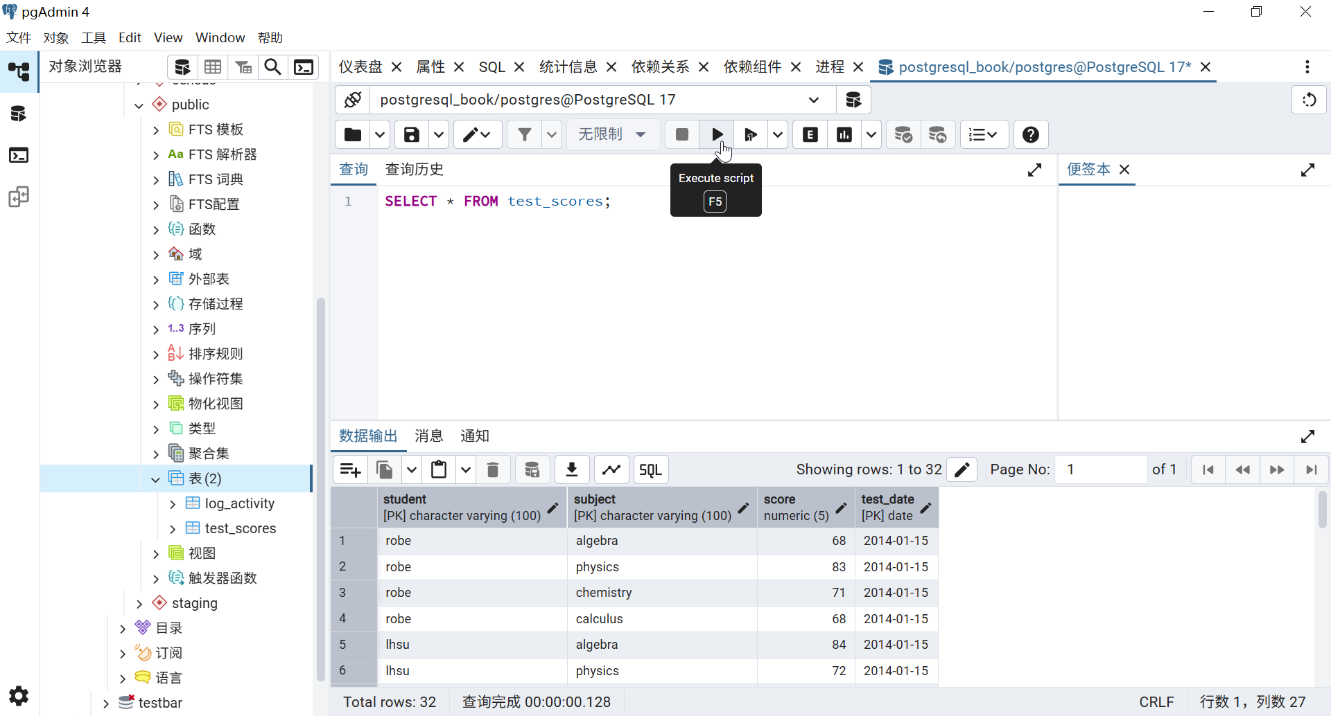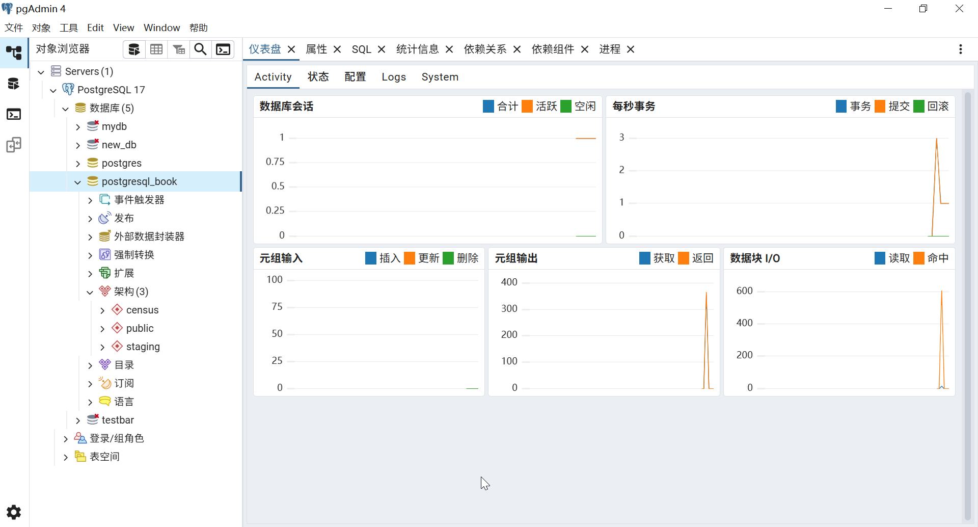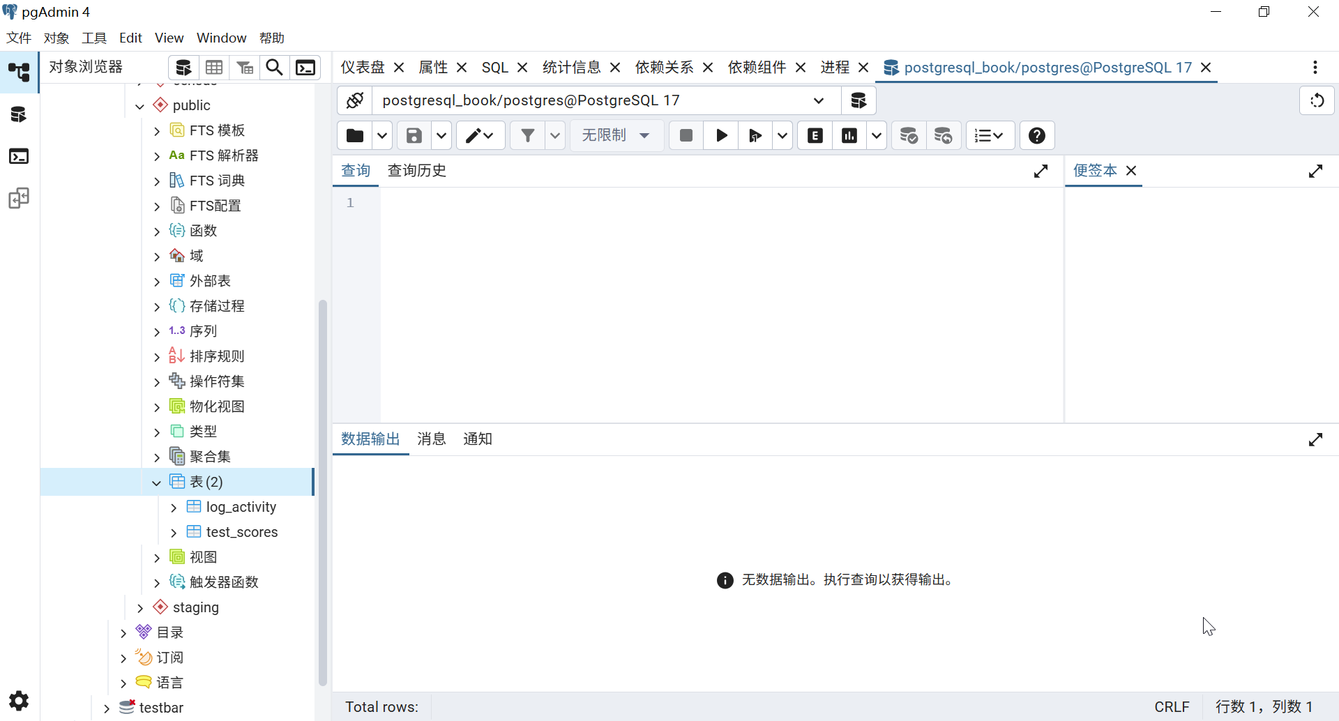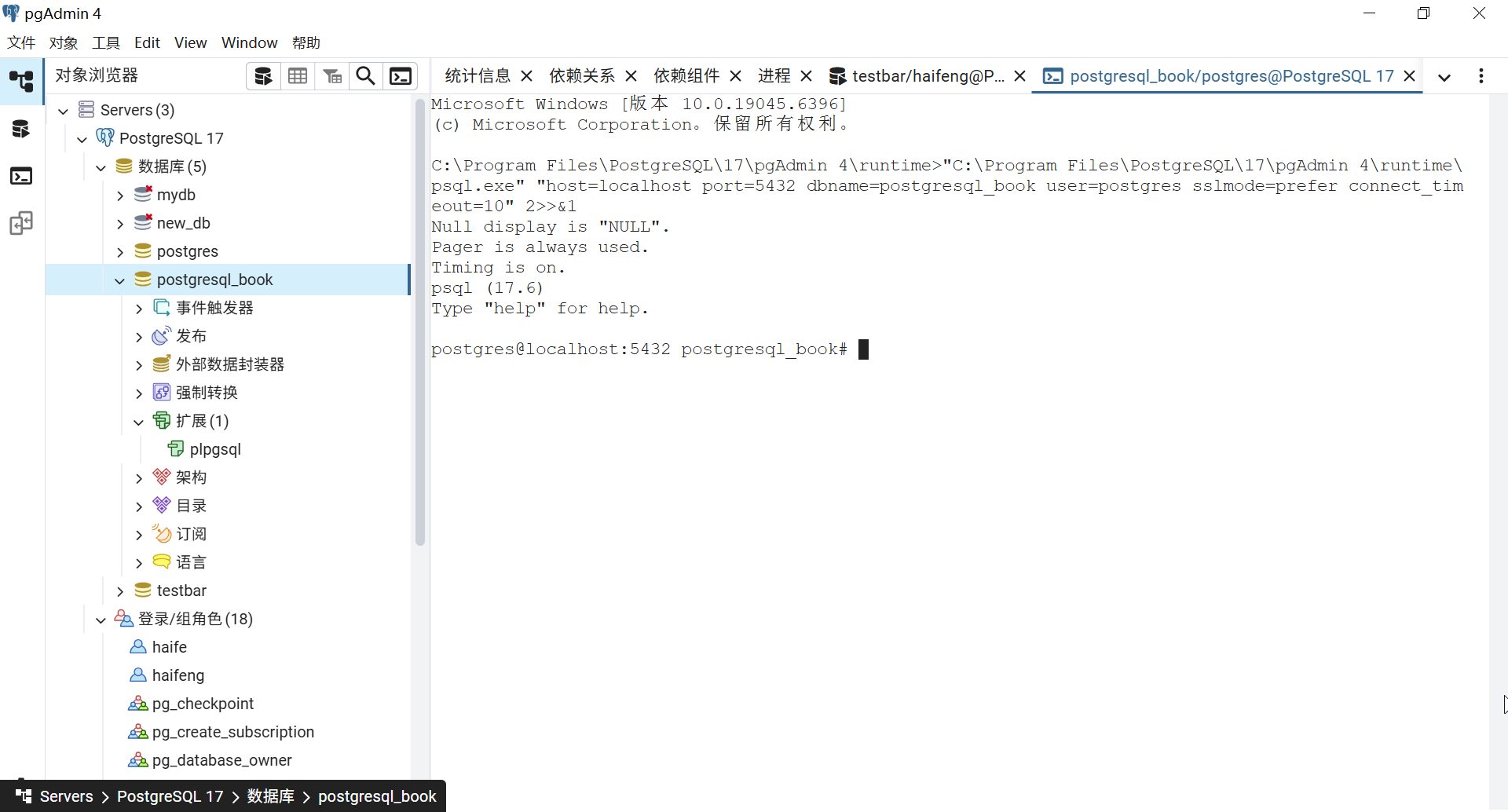 这是 pgAdmin4 中 psql 的界面, 跟操作系统下 psql 启动的界面差不多. 但在这里使用 psql 执行数据导入会慢一点, 可以尝试导入 postgresql_book 数据库, 速度显著慢于在操作系统命令行界面下直接使用 psql 导入的速度.