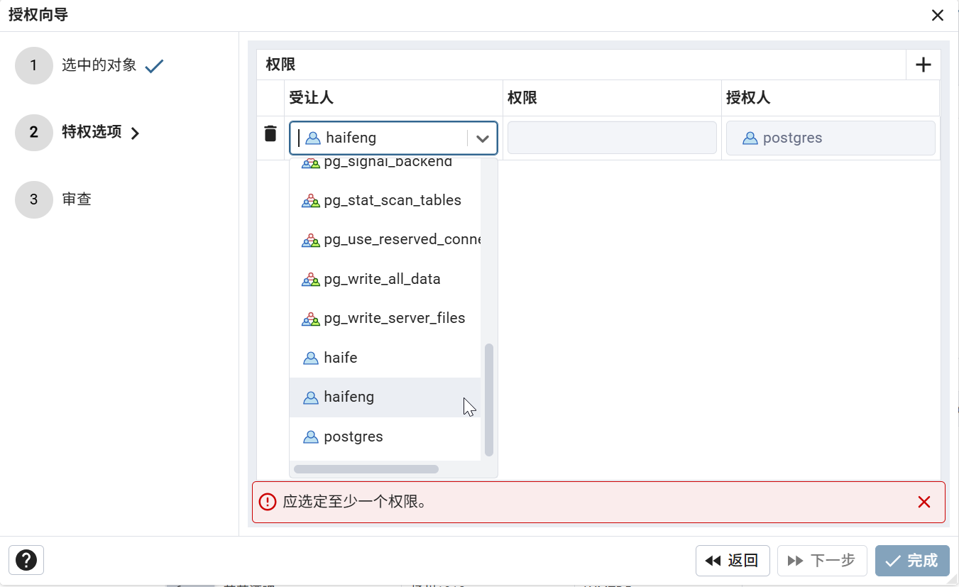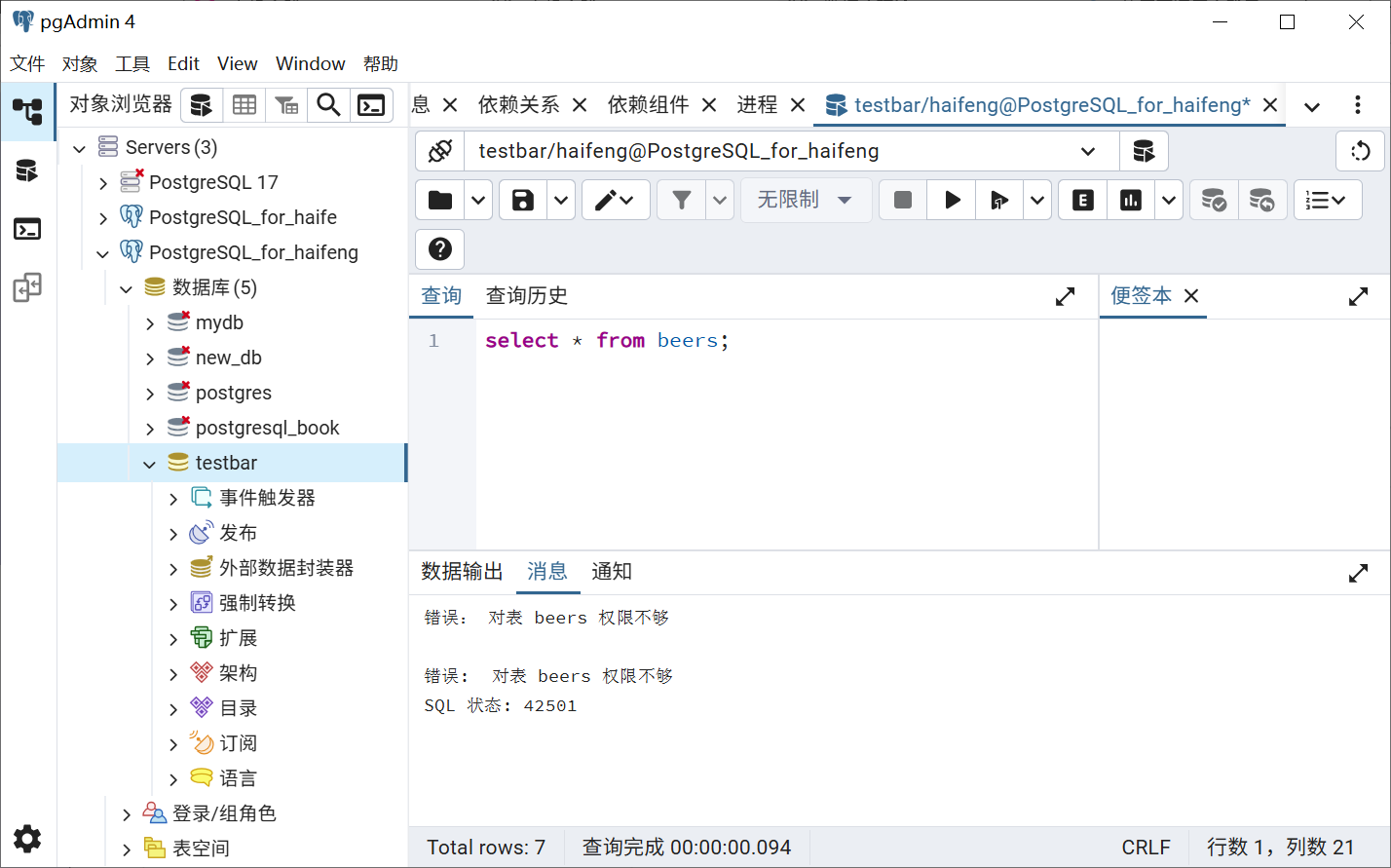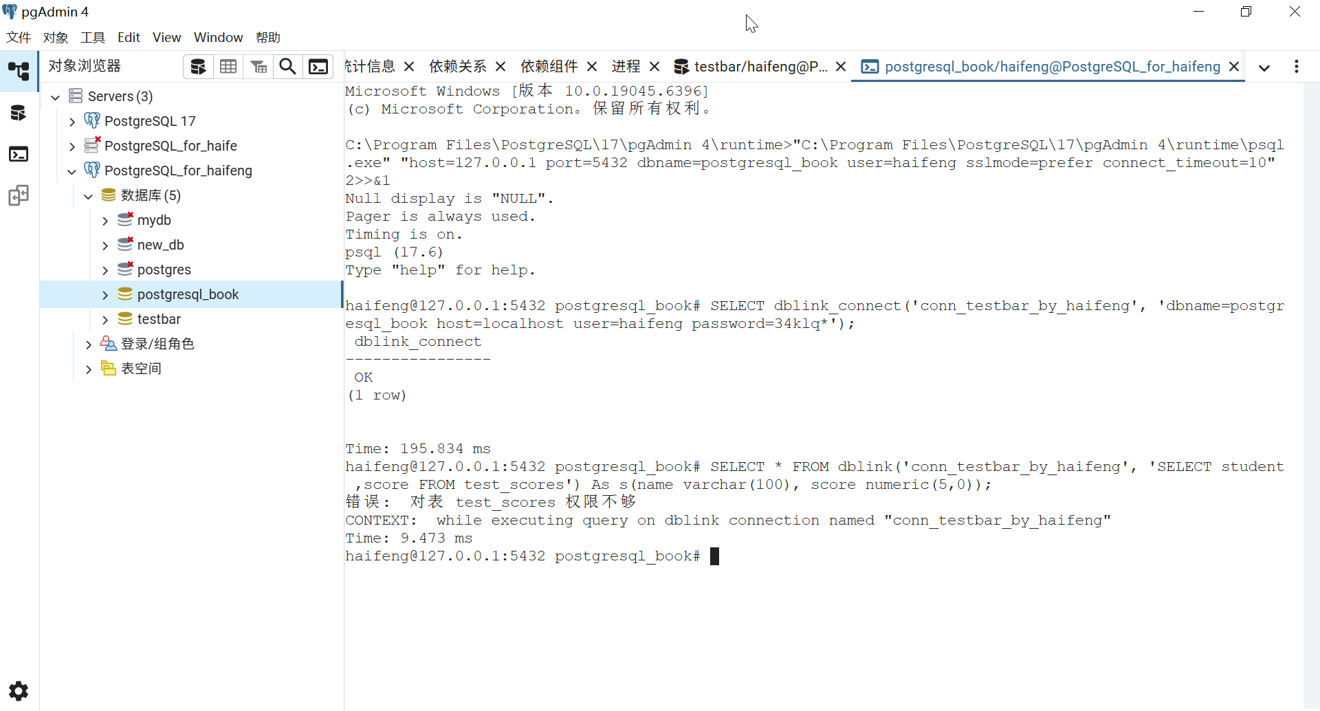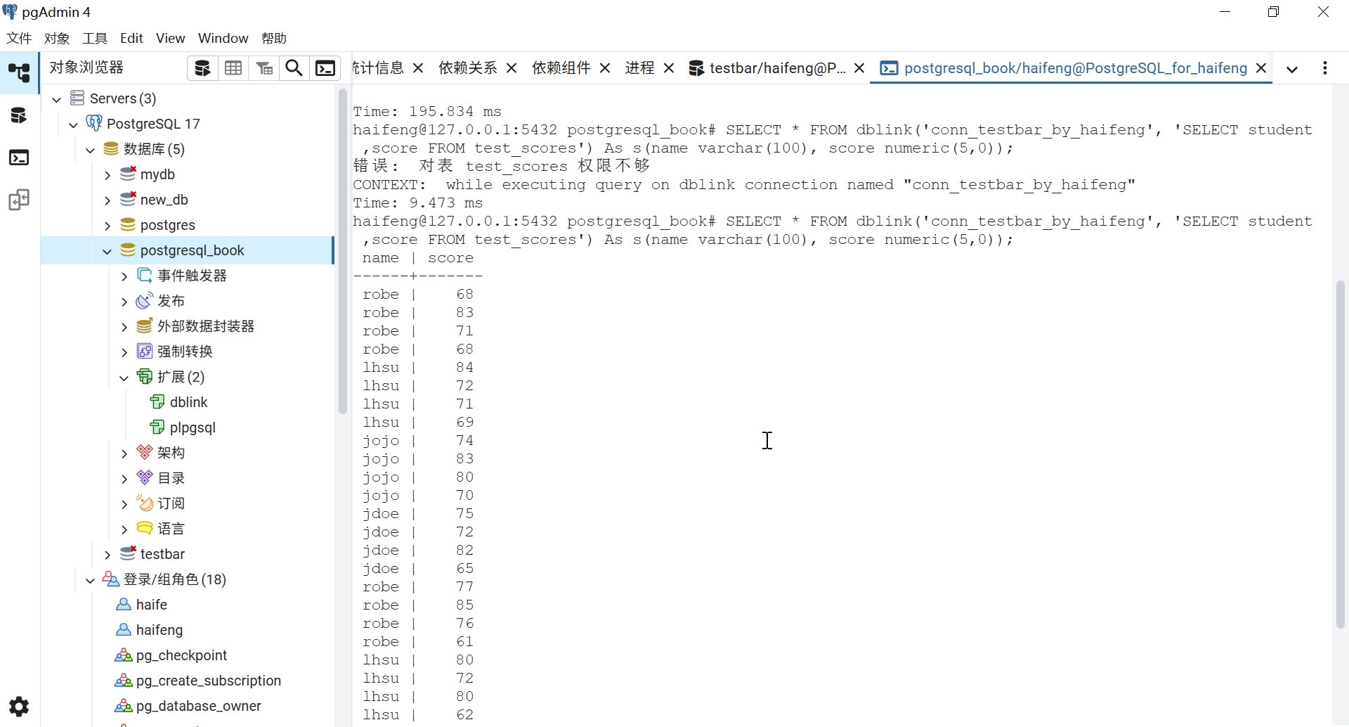 postgresql_book 数据库的所有者是 postgres, 用户haifeng 没有权限执行查询等操作.