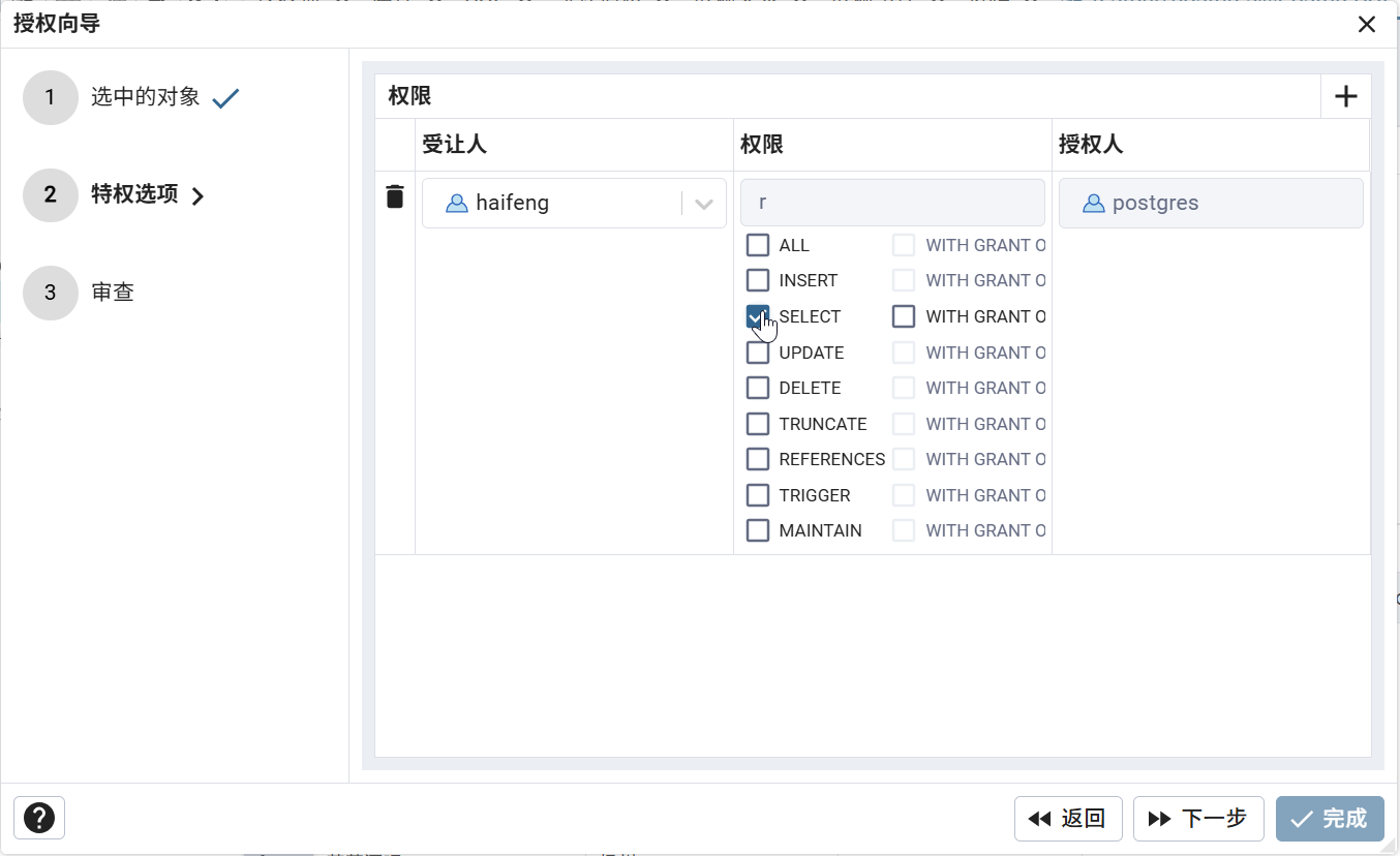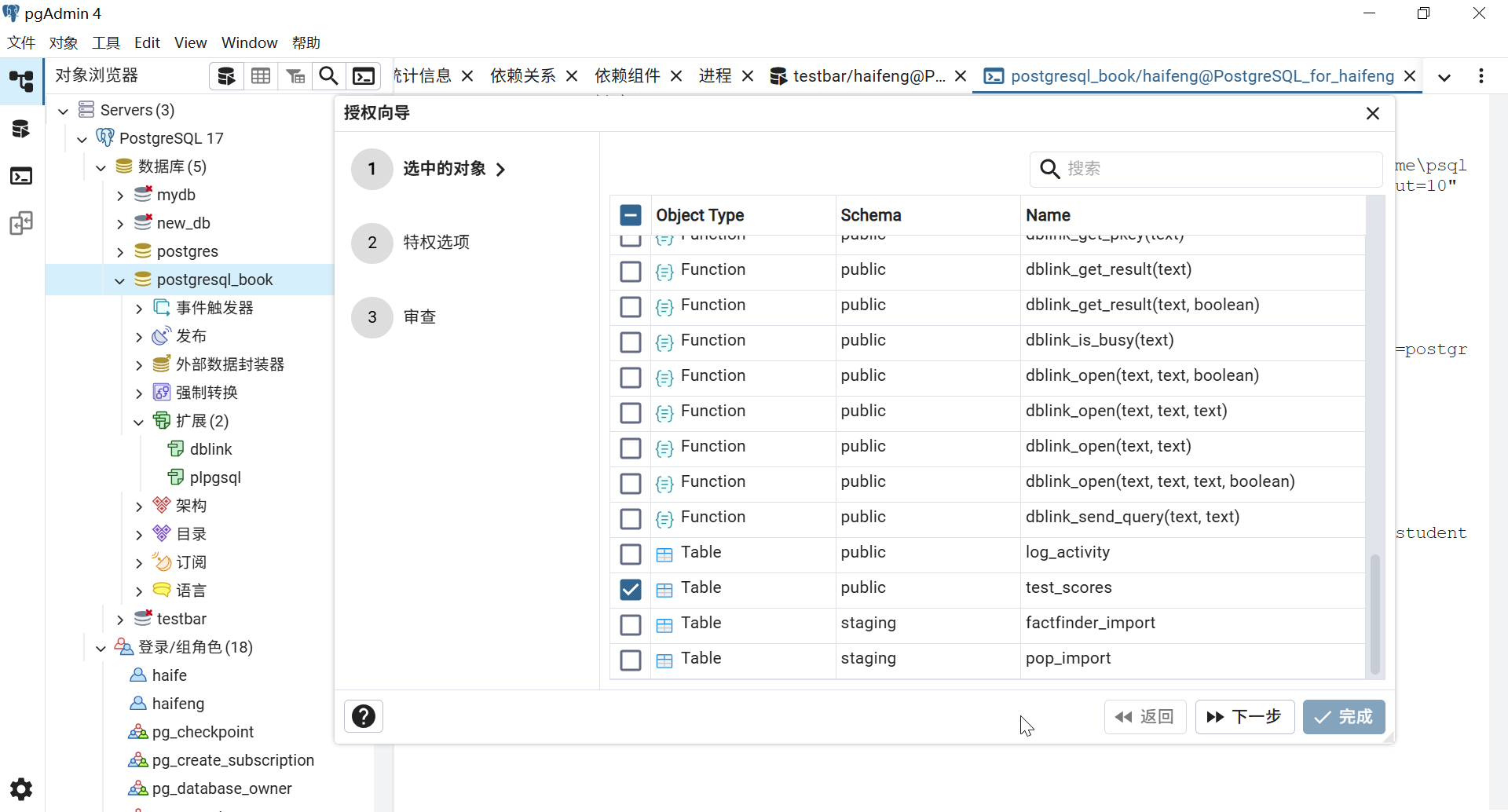 将 postgresql_book 数据库中 public.test_scores 表的查询权限赋予 haifeng. 注意得切换到 postgres 用户下进行权限的赋予.