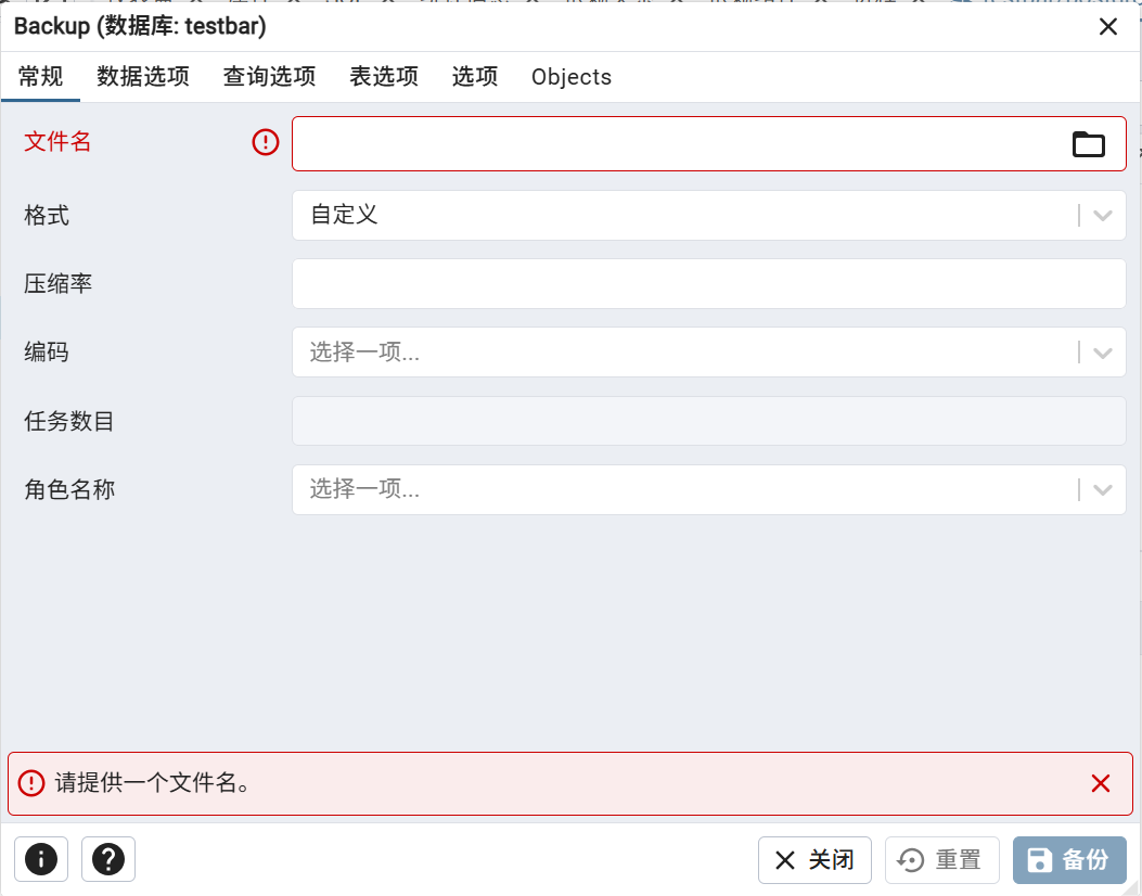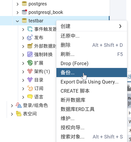 假设已经在 PostgreSQL 中导入了 testbar 数据库的很多数据. 为安全起见, 首先将其备份. 备份使用 pg_dump 命令.