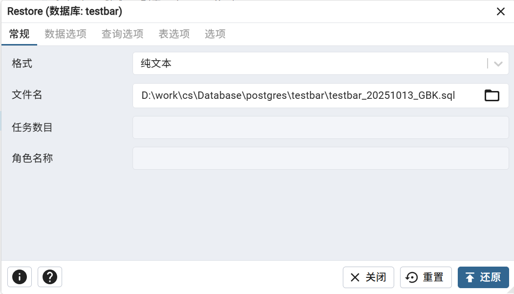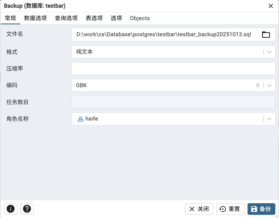 pg_dump -U haife -d testbar > testbar_20251013.sql --encoding=GBK