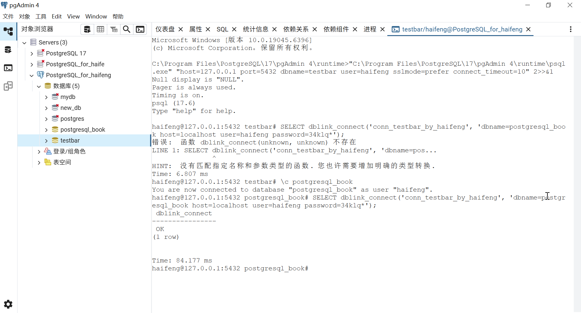 这里源数据库为 postgresql_book. 现在建立名为 conn_to_testbar 的到目标数据库 testbar 的连接.