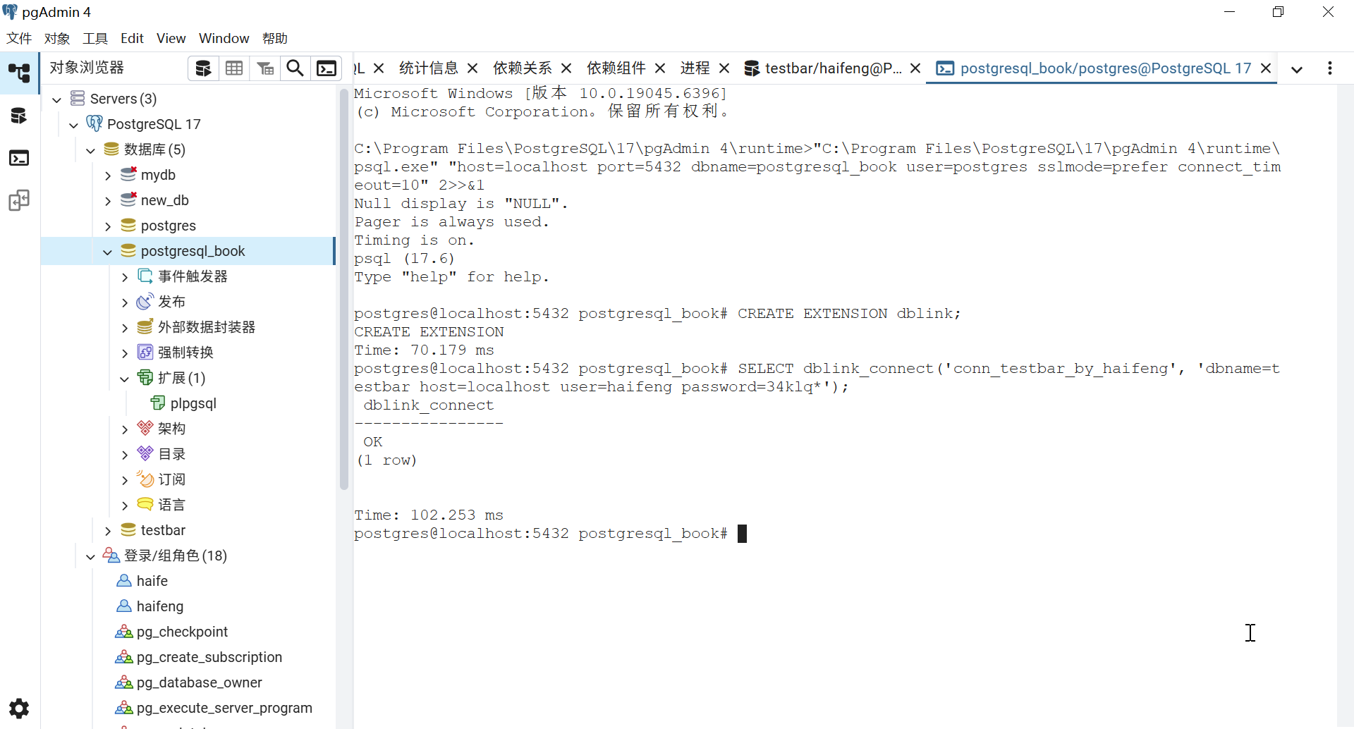 haifeng@127.0.0.1:5432 testbar# CREATE EXTENSION dblink; 错误: 创建扩展 "dblink" 权限不够 HINT: 只有超级用户能创建扩展. Time: 19.755 ms haifeng@127.0.0.1:5432 testbar#