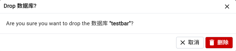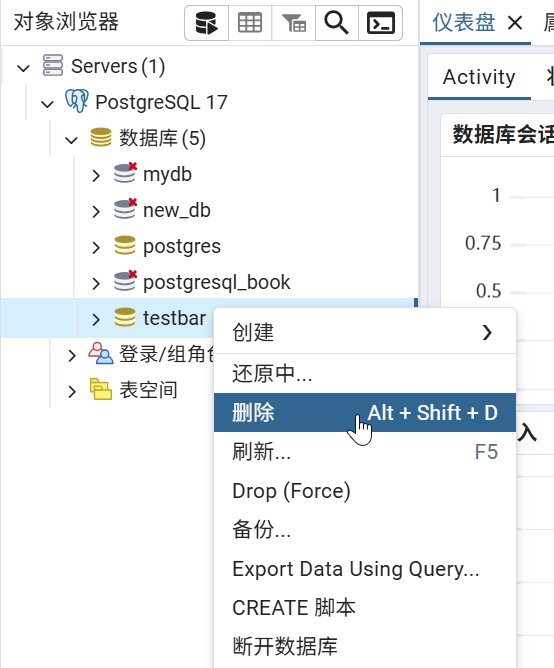 点击 testbar 数据库, 按 Alt+Shift+D 或右键点击删除.