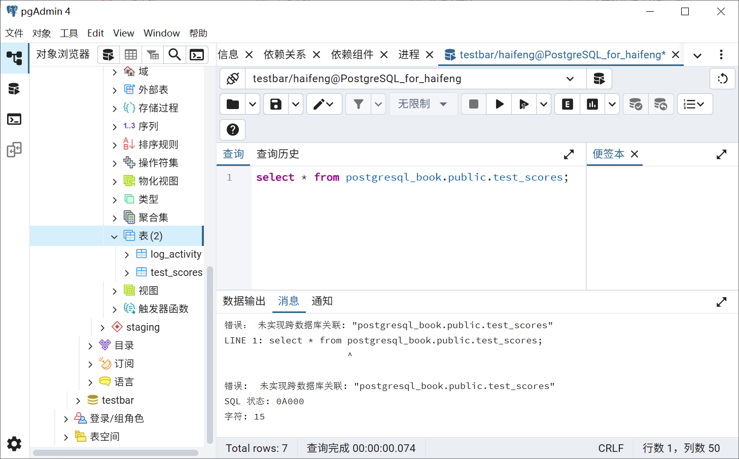 PostgreSQL 中的数据库彼此是独立的, 因此默认不支持跨数据库查询. 例如, 在当前用户 haifeng 连接数据库 testbar 后, 尝试查询 postgresql_book 数据库下 public 架构中的 test_scores 表中的数据. 结果返回错误: “未实现跨数据库关联”。