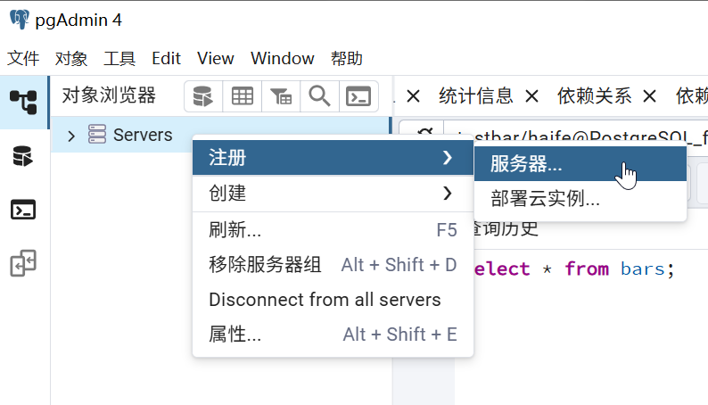若要使用其他角色登录服务器, 我们首先需要在 pgAdmin 中注册.
