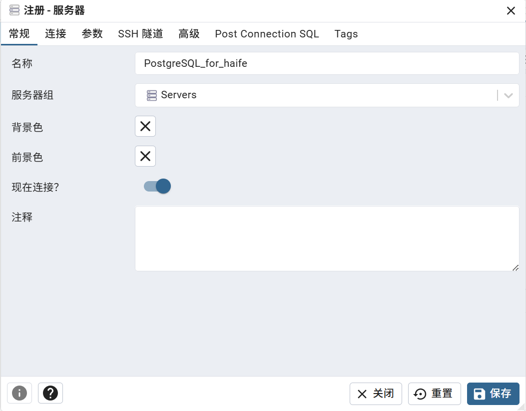 填写服务器的名称, 例如这里是供角色 haife 登录的, 故名称取为 PostgreSQL_for_haife.