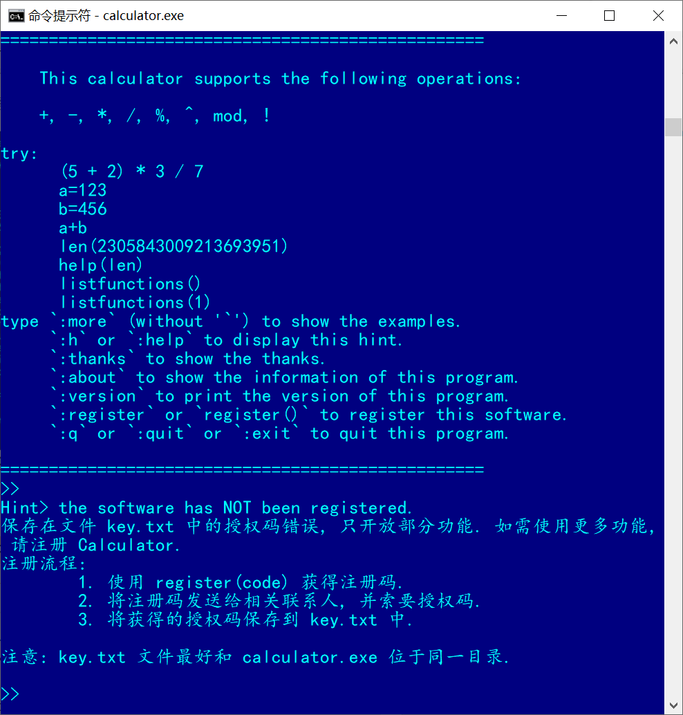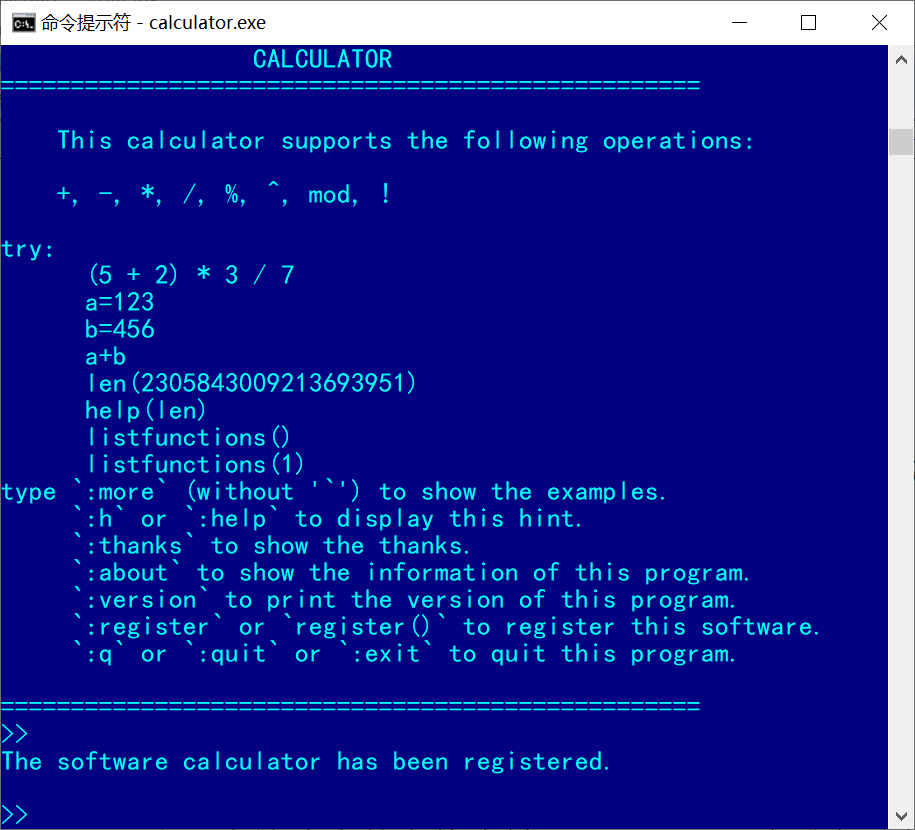 键入命令 :q 或 :quit 或 :exit 退出 Calculator.