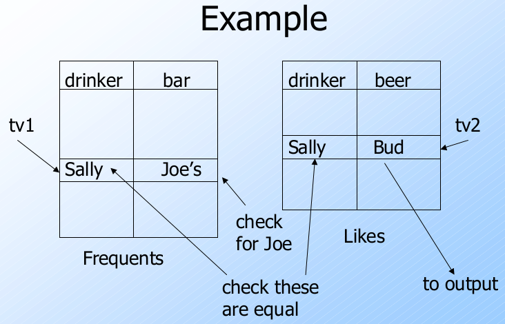 执行查询操作过程中, 会定义一个元组变量 $t$, 它将在所有元组(即这个关系)中进行循环, 检查第二个属性的值