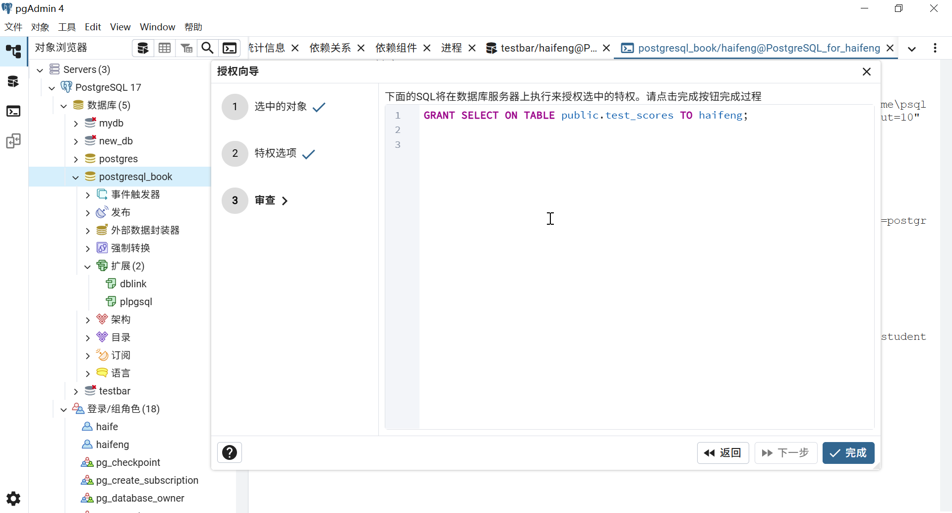 将 postgresql_book 数据库中 public.test_scores 表的查询权限赋予 haifeng. 注意得切换到 postgres 用户下进行权限的赋予.