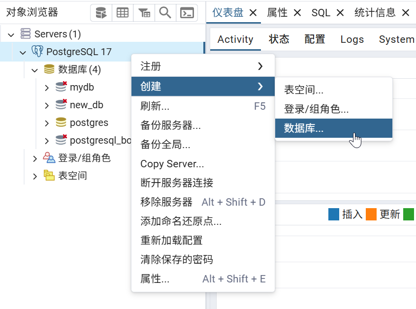 注意, 若点击的是 PostgreSQL 17, 按 Alt+Shift+N 则会打开注册服务器窗口.