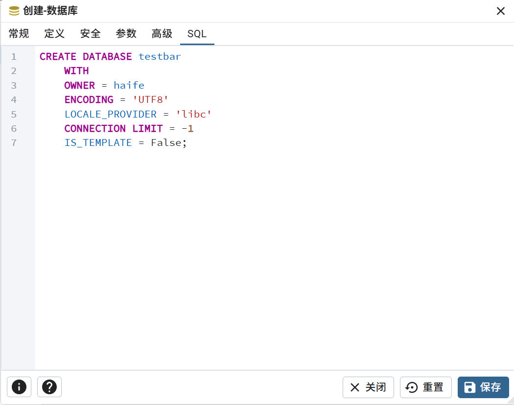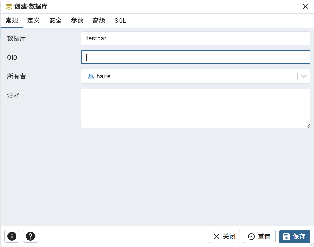 填入要建的数据库名 testbar, 选择所有者为 haife.