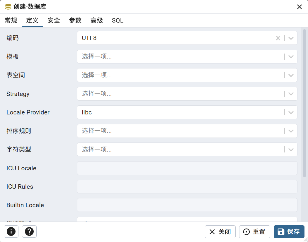 点击对象浏览器中的 PostgreSQL 17 或数据库, 右键==>点击【创建】==>数据库. 若点击的是“数据库”, 则可按快捷键 Alt+Shift+N, 出现下面的对话框.