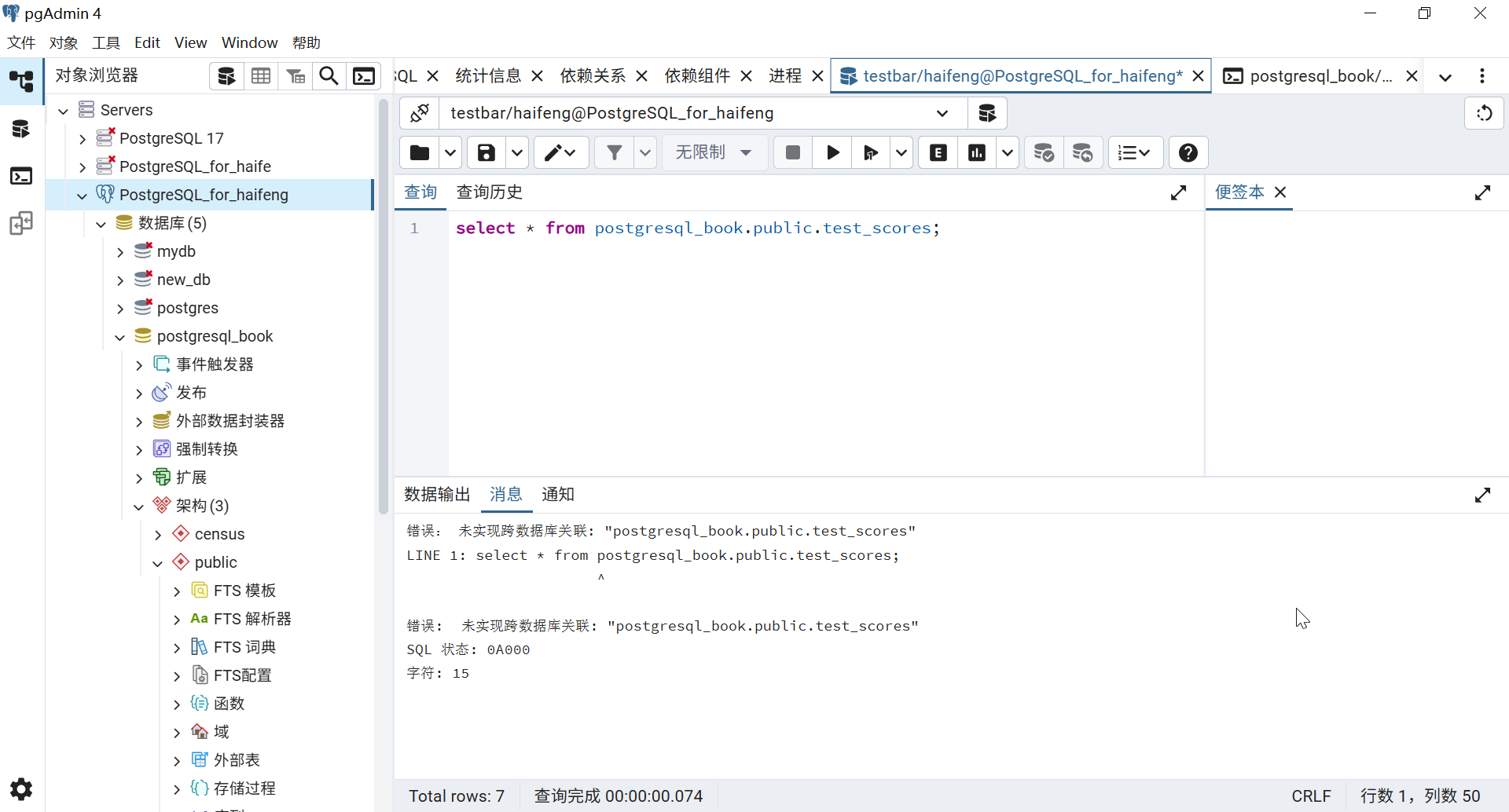 PostgreSQL 中的数据库彼此是独立的, 因此默认不支持跨数据库查询. 例如, 在当前用户 haifeng 连接数据库 testbar 后, 尝试查询 postgresql_book 数据库下 public 架构中的 test_scores 表中的数据. 结果返回错误: “未实现跨数据库关联”。