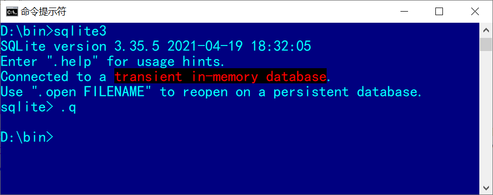 D:\sqlite3>sqlite3 test.db -- Loading resources from C:\Users\haife/.sqliterc SQLite version 3.46.1 2024-08-13 09:16:08 (UTF-16 console I/O) Enter ".help" for usage hints. sqlite>