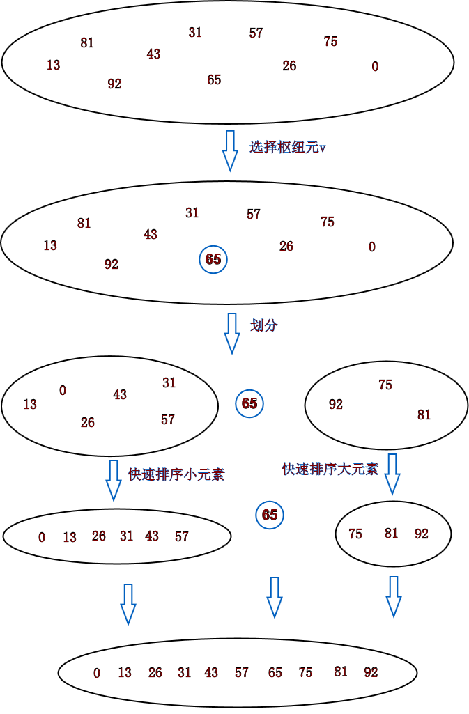 假设有一个随机的枢纽元(不用三数中值分割法), 并对一些小的文件不设截止范围. 和归并排序一样, 取 $T(0)=T(1)=1$. 快速排序的运行时间等于两个递归调用的运行时间加上花费在分割上的线性时间(枢纽元的选取仅花费常数时间). 从而我们得到基本的快速排序关系: